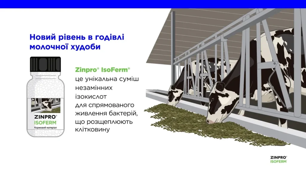 Zinpro® IsoFerm® – це запатентована суміш летких жирних кислот з розгалуженим ланцюгом, яка була спецуіально розроблена для поліпшення роботи рубця. Єдиний у своєму роді продукт, Zinpro IsoFerm забезпечує незамінними нутрієнтами бактерії рубця, що покращує природний процес ферментації та підвищує загальну перетравність раціону, а отже поліпшує ефективності використання корму.
